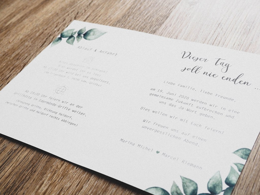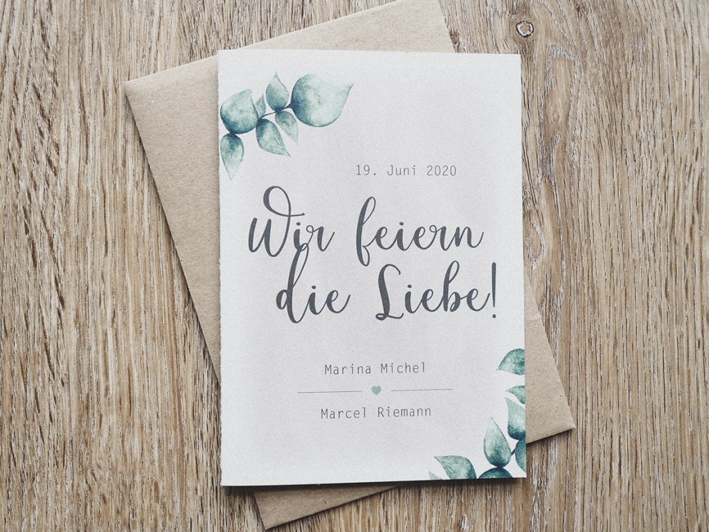 Es ist immer schön, wenn Kunden schon eine gewisse Vorstellung mit in unser Gespräch bringen. So wissen beide Seiten direkt in welche Richtung es gehen soll. Das Kennenlerngespräch mit Marina & Marcel lief von Anfang an sehr angenehm und total persönlich ab – der Auftrag war schnell definiert. Eukalyptuszweige sollten sich in der Einladung wiederfinden. Ich kombinierte den Wunsch von rustikalen Elementen mit der Stilrichtung der in 2021 geplanten Hochzeit: Vintage.
