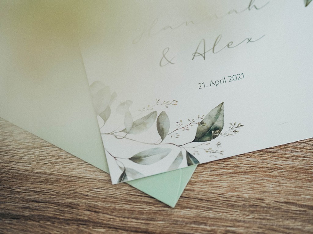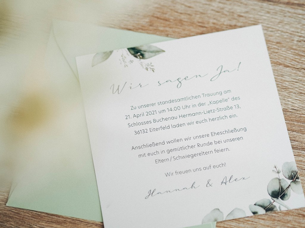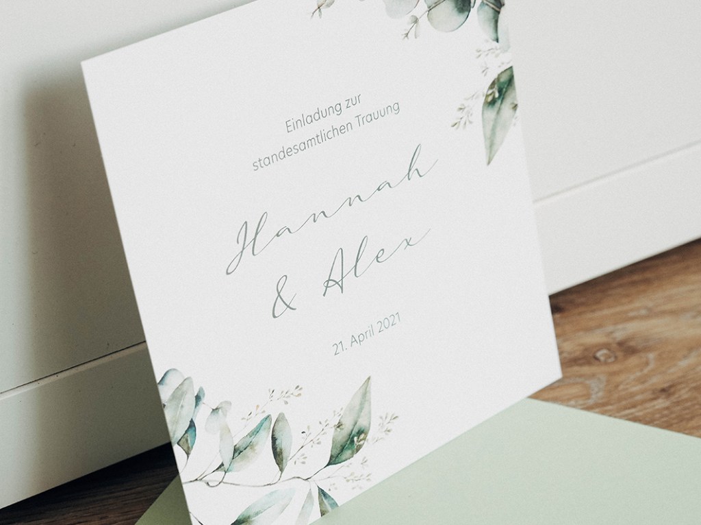 Vor einiger Zeit kontaktierten mich Hannah und Alex bezüglich ihrer standesamtlichen Hochzeit über meine Webseite. Sie hatten bereits klare Vorstellungen in welchem Stil ihre Einladungen gestaltet werden sollten: Clean, mit viel weißem Raum und Eukalyptus-Elementen. Um der Karte ein gewisses filigranes Design zu verleihen, habe ich mich dazu entschieden, den klassischen Eukalyptus zusätzlich mit der Variante des Eukalyptus Popolus zu kombinieren. Diese Elemente formen nun den Rahmen für den Fließtext, für den ich eine serifenlose Schrift gewählt habe, verbunden mit einem feinen, handgeschriebenen Schriftschnitt, was den klassischen Stil unterstützt. Wir haben uns außerdem für ein quadratisches Format (120 x 120 mm) entschieden. Insgesamt ist dadurch ein stimmiges Gesamtbild entstanden, dass durch mattes Papier und einem hellgrünen Umschlag zum Versenden abgerundet wurde.